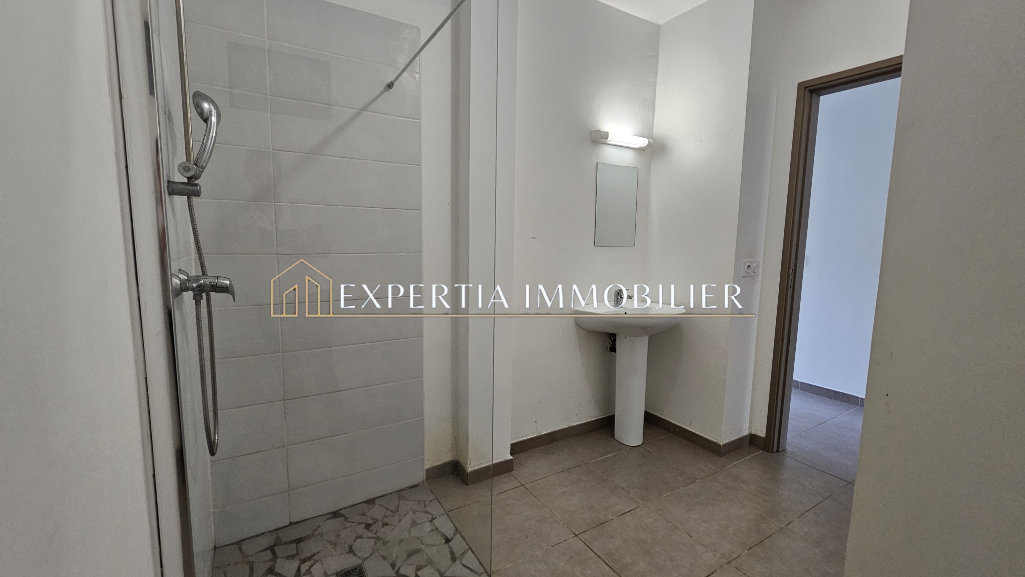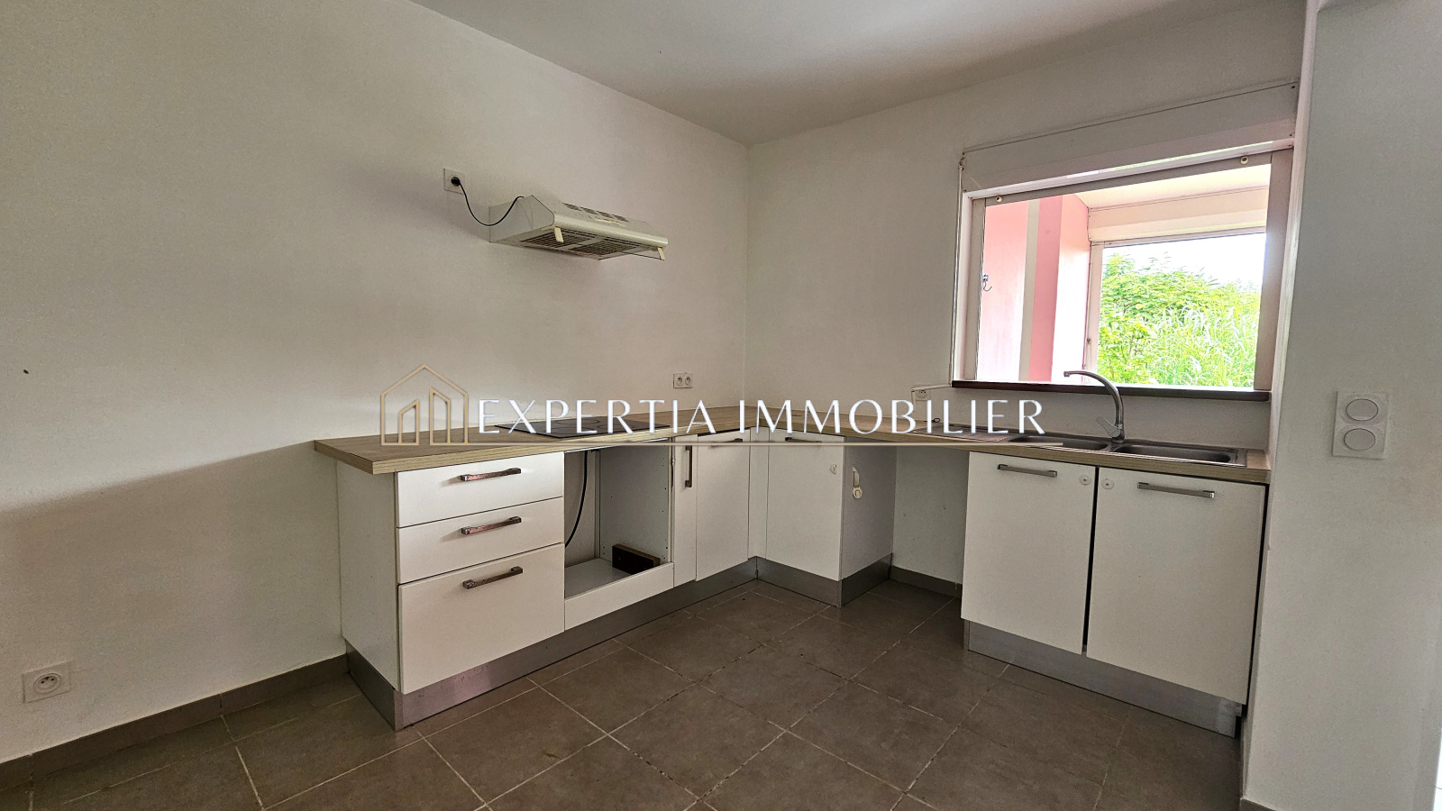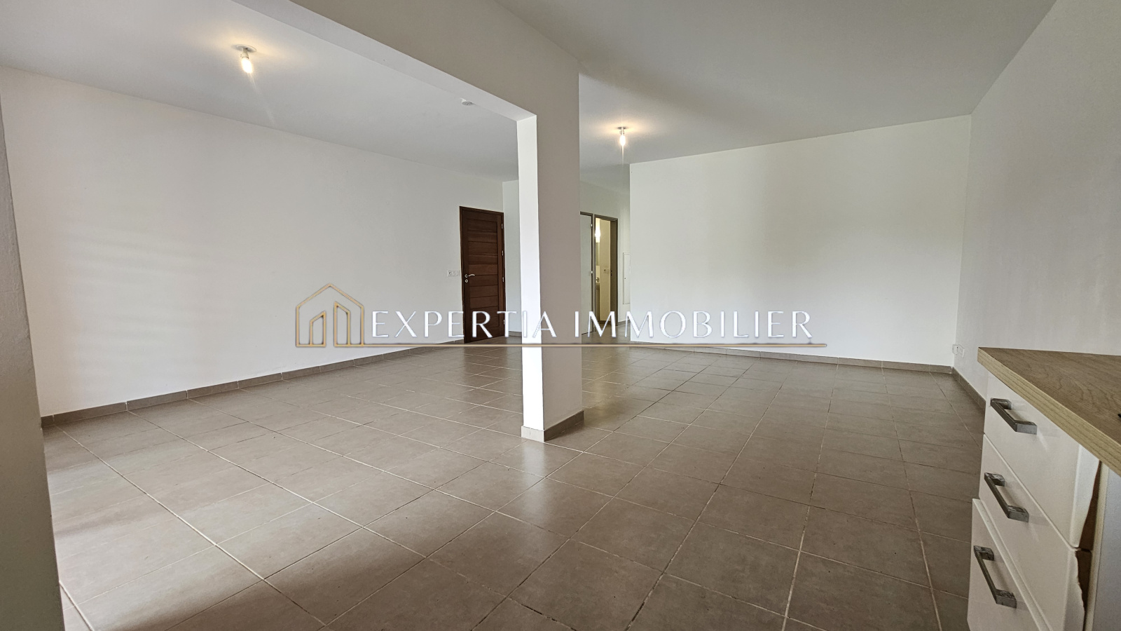 La pièce de vie, spacieuse et lumineuse, se compose d’un grand salon avec cuisine ouverte aménagée, complétée par une buanderie fonctionnelle. Un passe-plat relie la cuisine à la terrasse, offrant une vue dégagée et une agréable ouverture sur l’extérieur, idéale pour les repas et moments de détente.